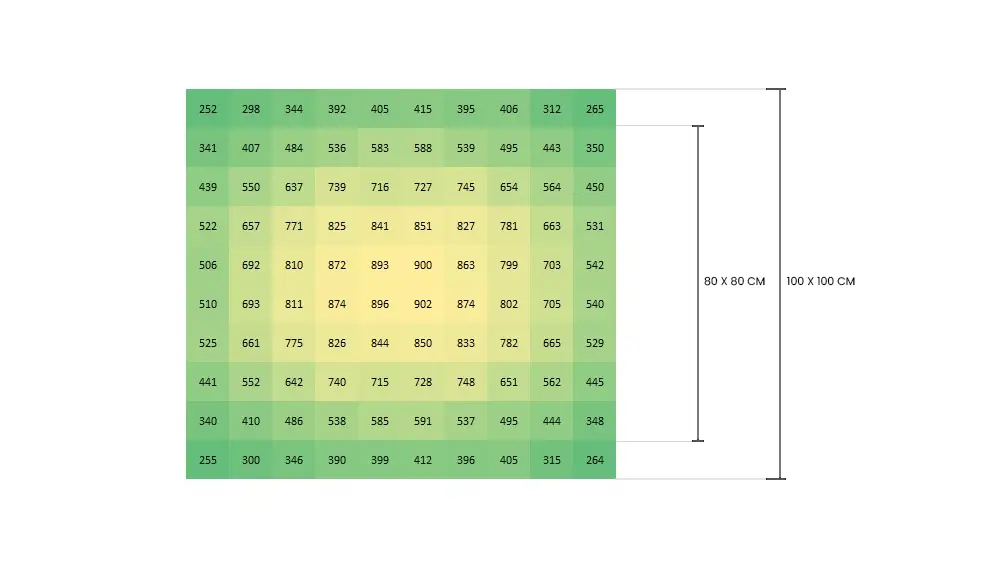 Canopy Master fue diseñada para distribuir los fotones de forma uniforme sobre toda la superficie de cultivo, generando un nivel de PPFD equilibrado en el canopy.