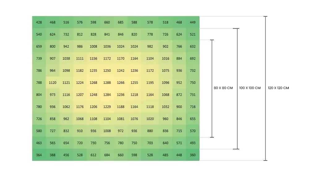 Canopy Master fue diseñada para distribuir los fotones de forma uniforme sobre toda la superficie de cultivo, generando un nivel de PPFD equilibrado en el canopy.